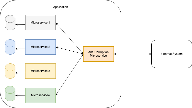 The diagram above shows an application consisting of 4 microservices, 3 of which communicate with the same external system via an Anti-Corruption Microservice. Communication between the microservices and the ACM always uses the data model and architecture of the application. Calls from the ACM to the external system conform to the external system’s data model and methods. The ACM contains all the logic necessary to translate between the two systems.