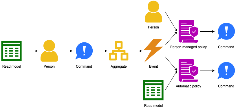 • An aggregate accepts commands and emits events. (yellow)