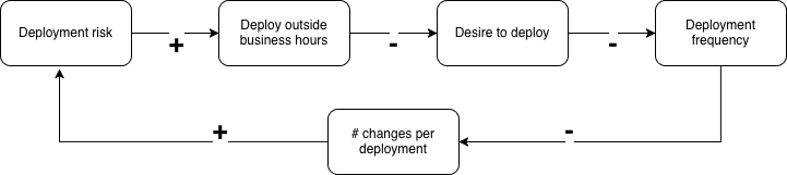 This shows us that, while we set out to reduce deployment risk, the way we did that also ends up increasing it: less frequent deployments lead to more changes per deployment and thus to more risk per deployment. This addition shows why the diagram’s name contains “loop”: most systems contain loops.